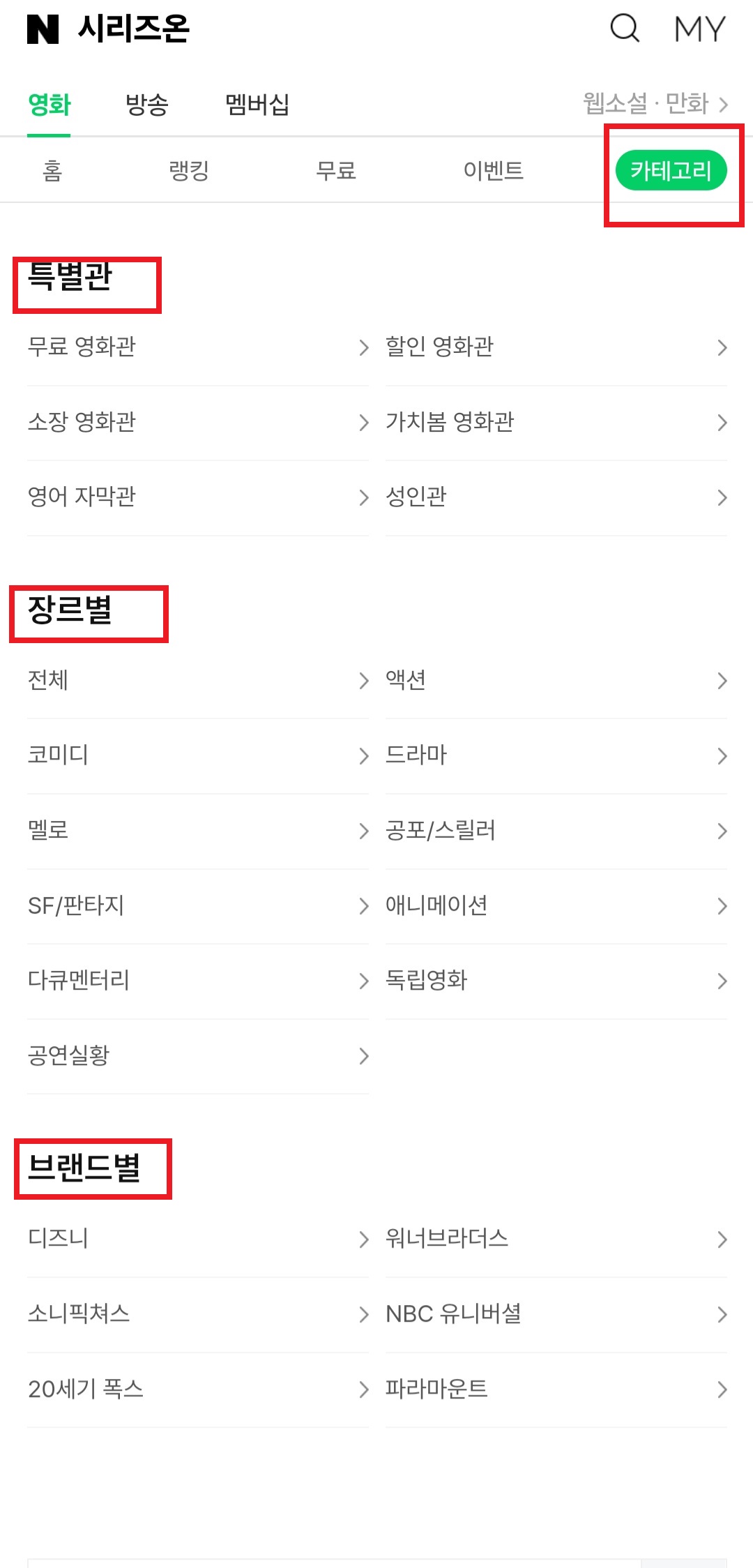 카테고리도 잘 정리가 되어있어서 원하는 영화나 장르, 브랜드별로 골라서 볼 수 있는 편리함을 갖추고 있는 네이버 시리즈온입니다.
