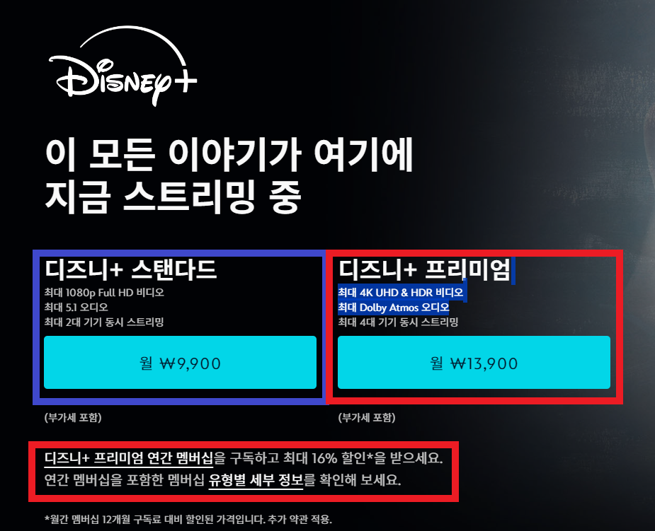 * 디즈니+프리미엄 : 월 13,900원, 연간 멤버십 구독하면 16% 할인을 해준다고 합니다.