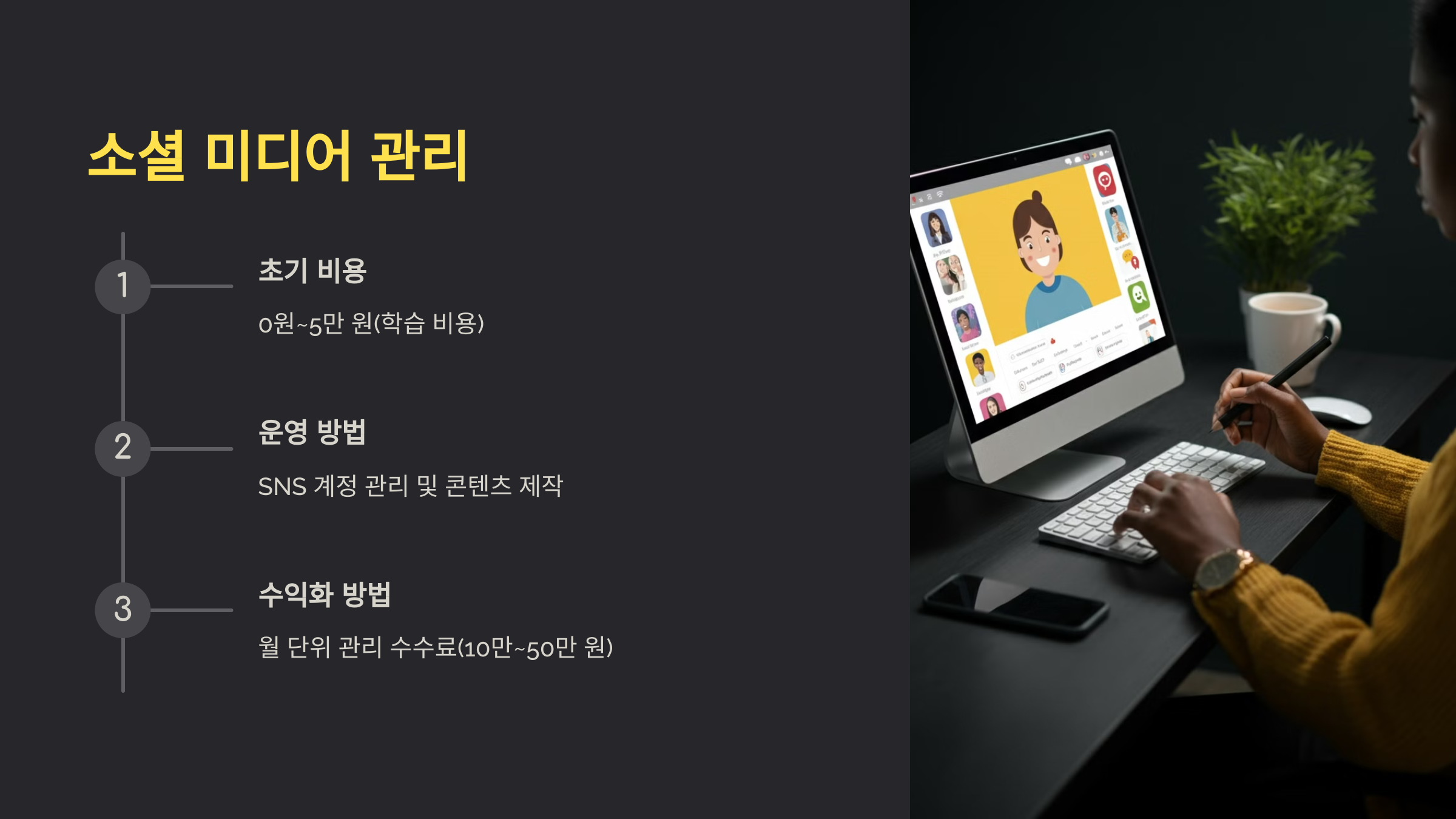 - 월 단위 관리 수수료(한 계정당 10만~50만 원).