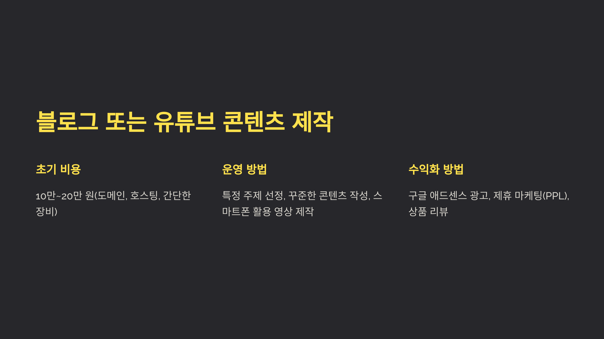 - 블로그: 특정 주제(재테크, 여행, 리뷰 등)를 선정해 꾸준히 콘텐츠를 작성.