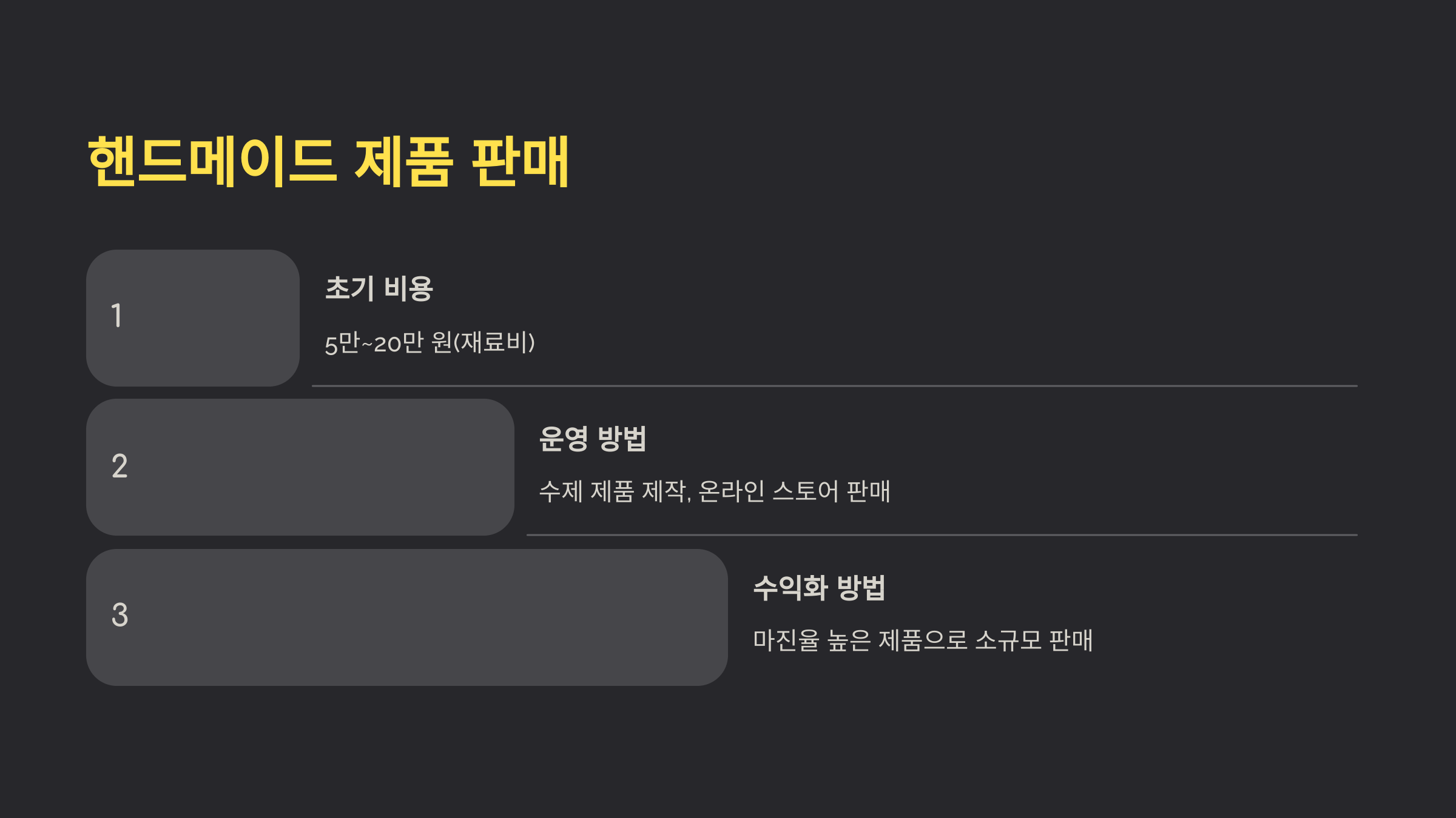 - 마진율 높은 핸드메이드 제품으로 소규모 판매를 시작.